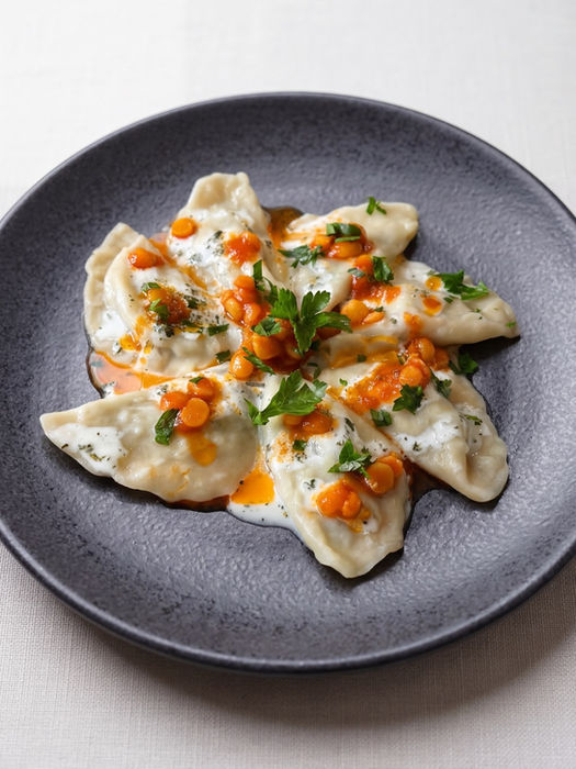 Delicate dumplings filled with fresh leek, topp it off with garlic yogurt and just the right touch of spiced lentils or meat sauce (you choose!).
